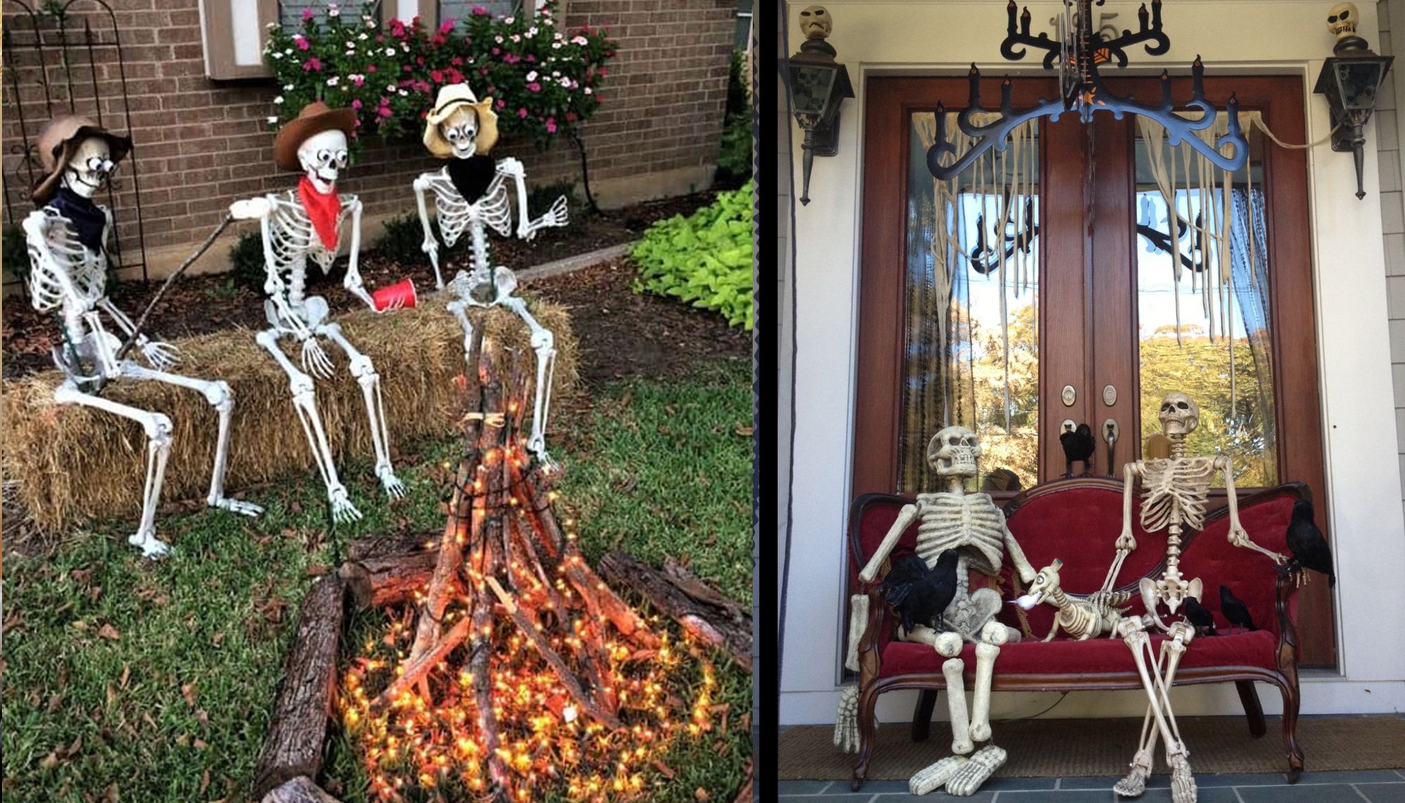 Skeletons are a great way to have some bone-chilling fun with your outdoor décor. Dress them up and prop them on your porch chairs to greet your trick-or-treaters this year.