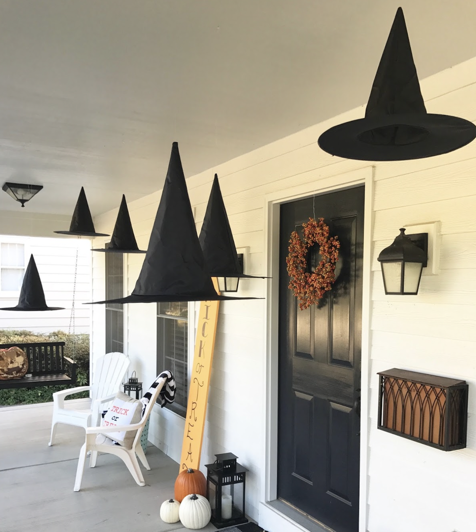 This idea is absolutely bewitching, if we do say so ourselves! Easily hang witch hats with fishing line and tacks to enchant your front porch this Halloween. To add some more magic, you can even make them light up.