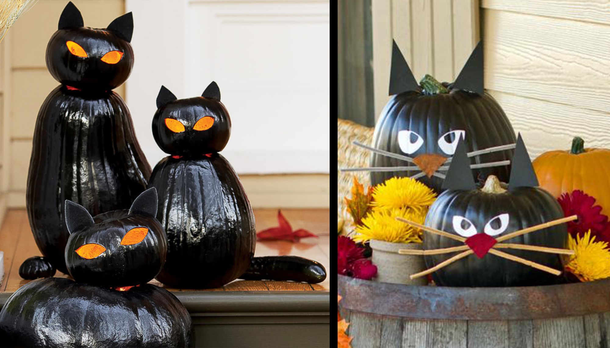 There's no need to be superstitious about this fun setup! Switch up your pumpkin decorations this Halloween by creating these black cat-o'-lanterns. They're made from stacked pumpkins and black paint. Place a candle inside to make their eye glow!
