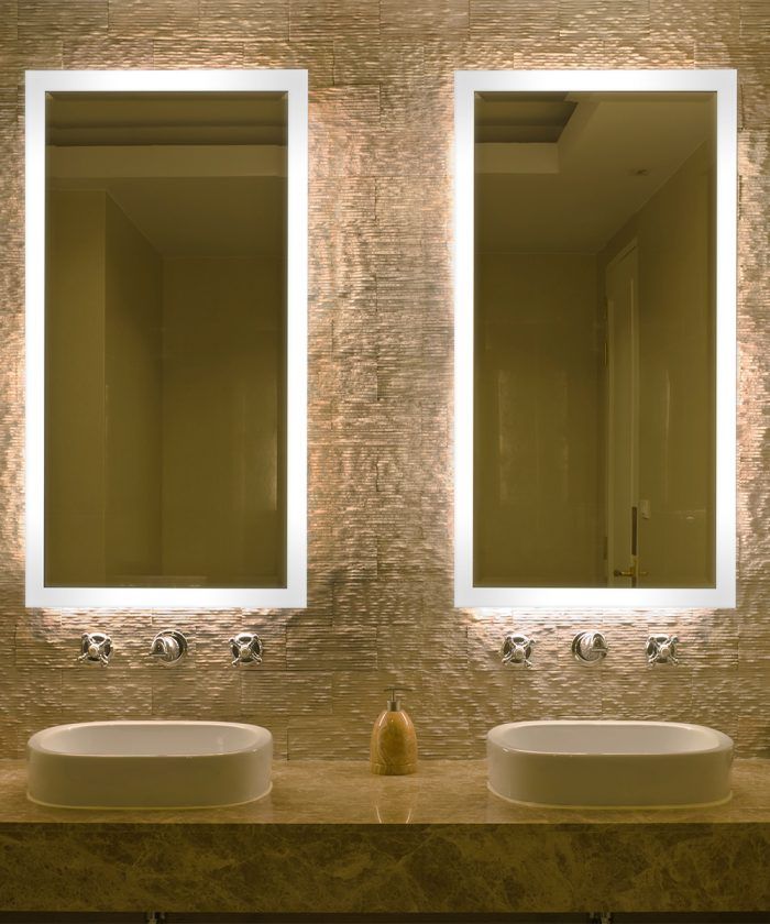 Backlit mirrors are growing in popularity, and offer ambient lighting without added glare or reflections on the mirror. This eye-catching lighting can be decorative as well as functional by doubling as a nightlight when dimmed. “A backlit mirror creates a glowing effect on the wall giving the illusion of a floating mirror,” says Linda Lang, senior staff designer at Robern. This effect can be used to create a focal point or highlight textured wall surfaces behind the fixture.