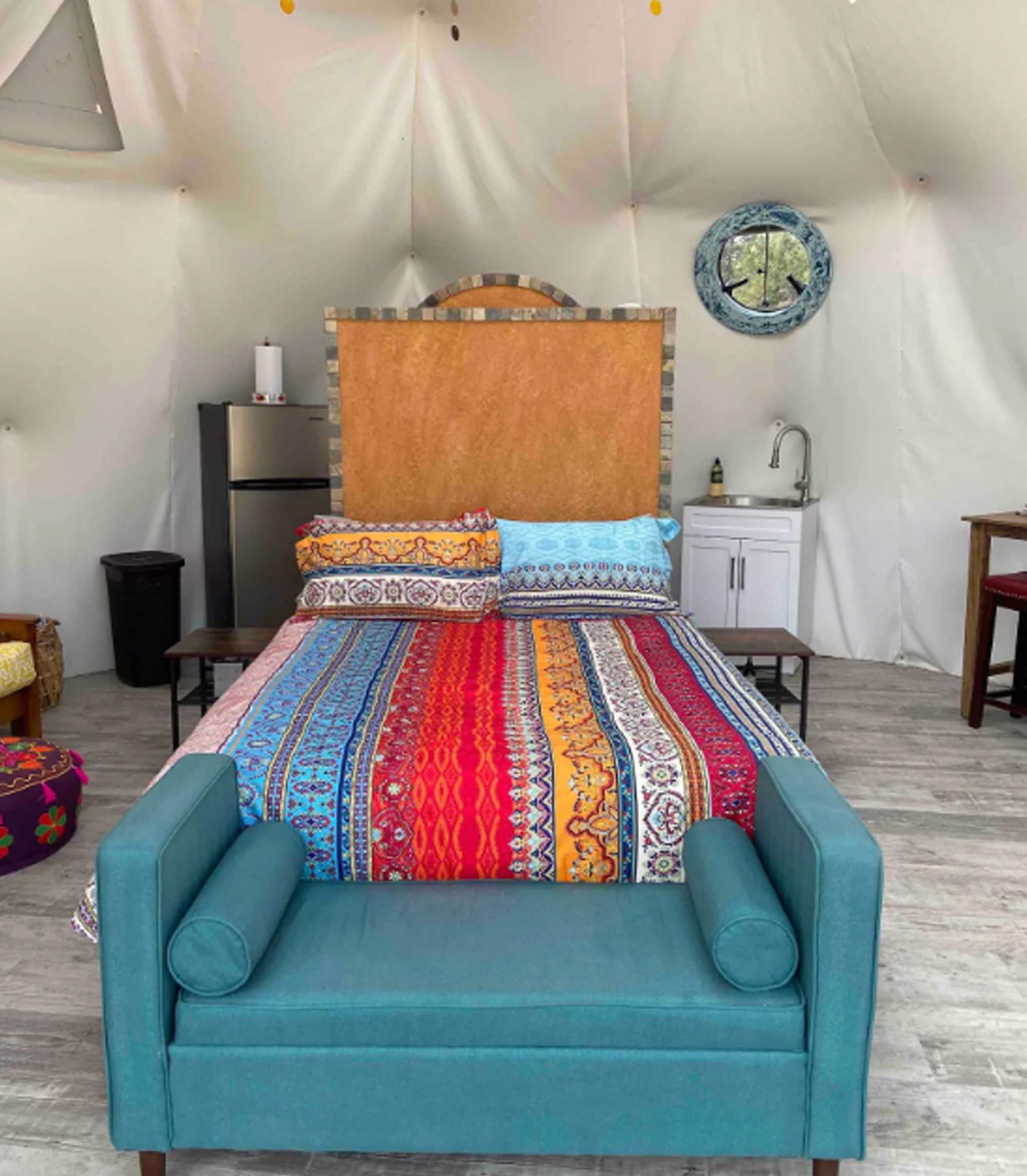 There is nothing like the feeling of private glamping bliss at Cedar Lights Retreat! This new boho styled dome features its own heat and air conditioning, an incredibly comfortable queen size memory foam bed, kitchenette and private heated outhouse. A cozy futon couch transitions to a double bed.