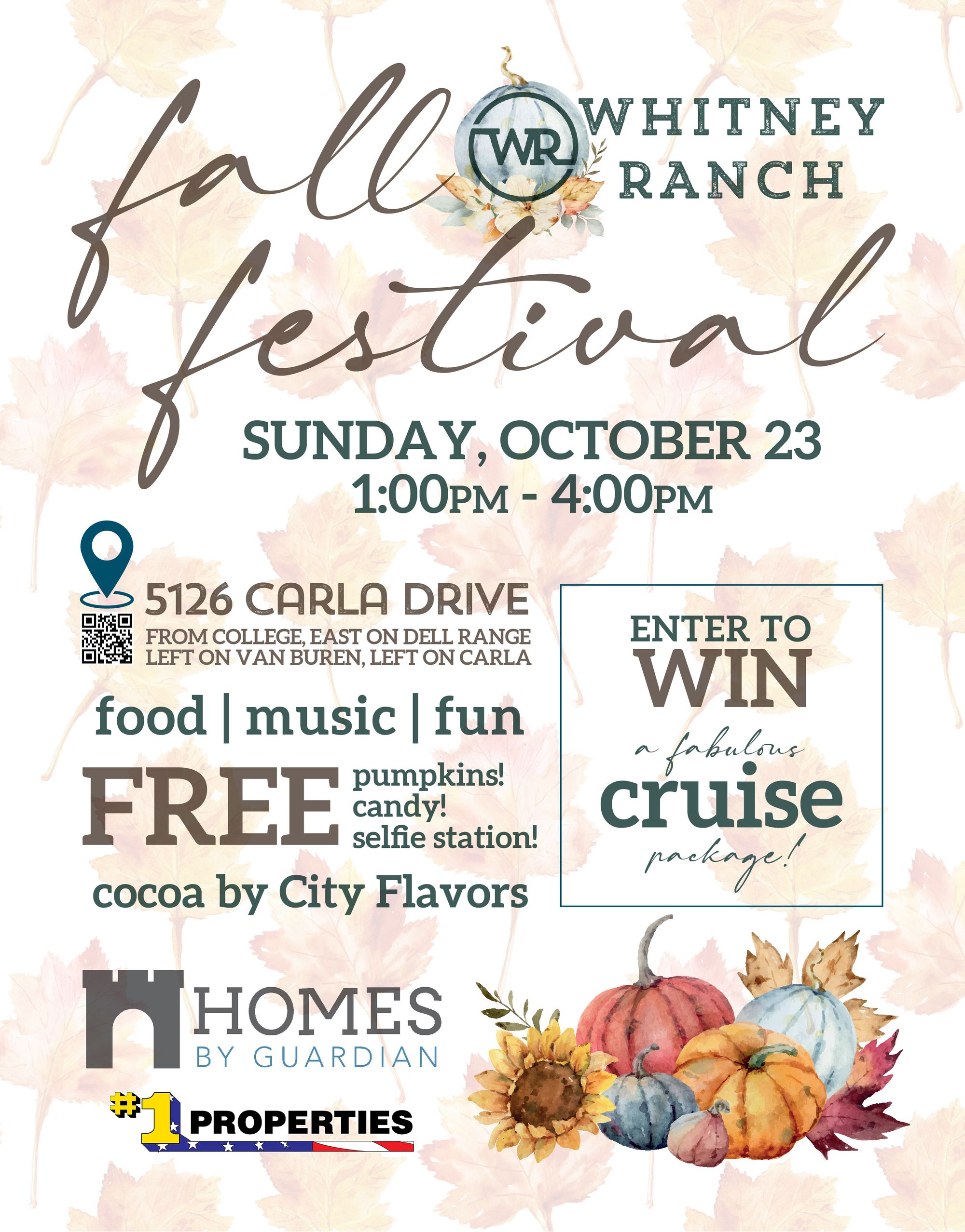 Join us at Cheyenne's newest neighborhood, Whitney Ranch, for fabulous family fun with FREE pumpkins, candy, BBQ, festive selfie station, music, and more!! This great event will take place on Sunday, October 23rd from 1pm-4pm.