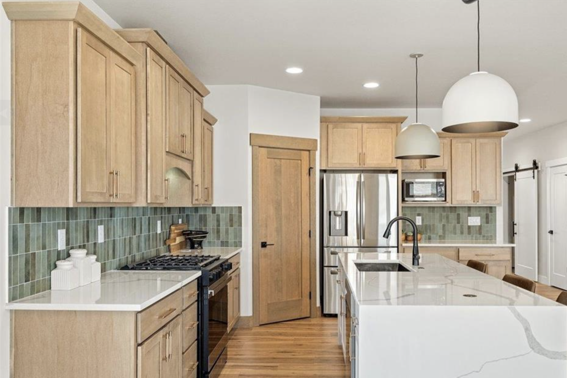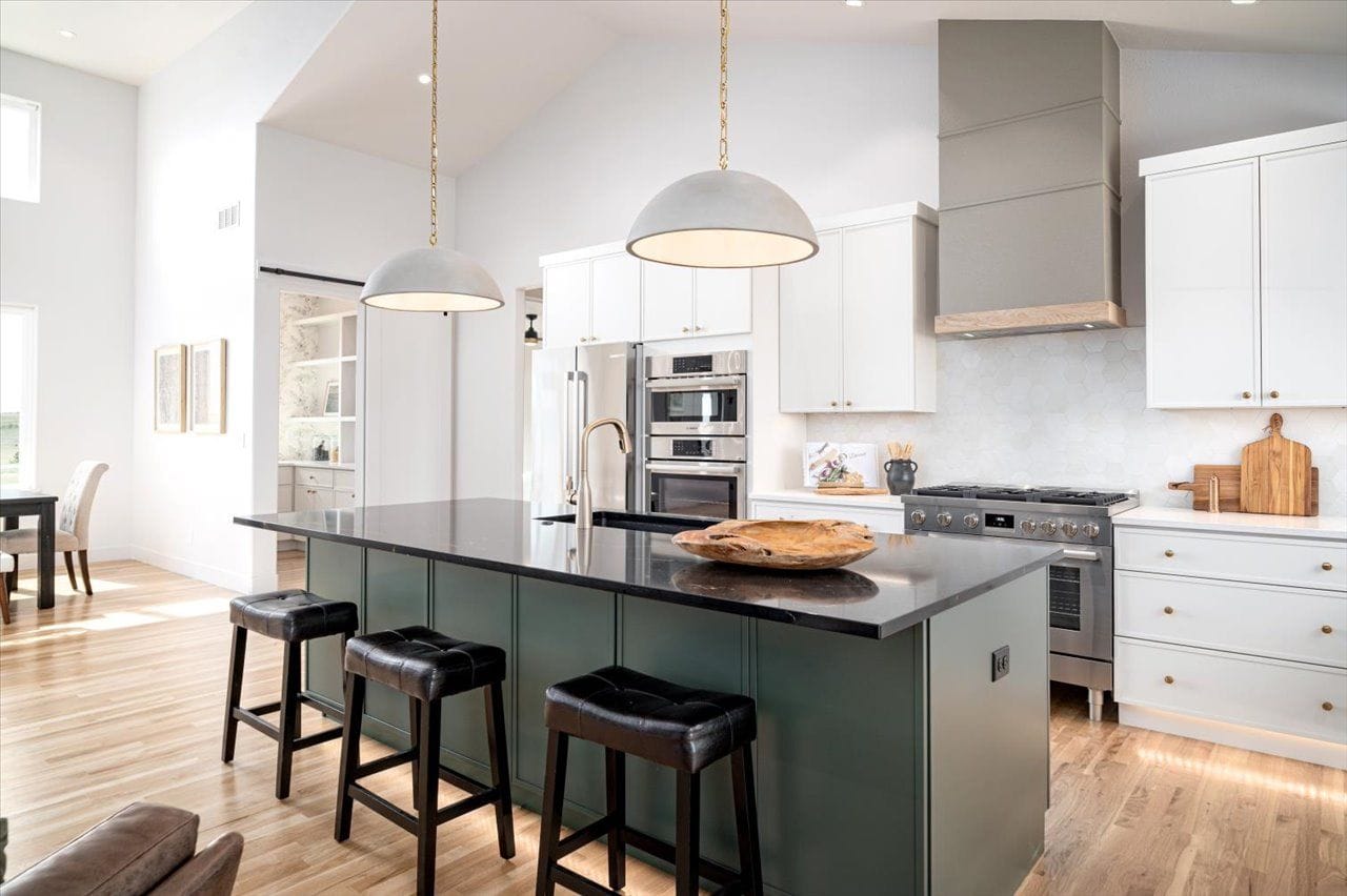 Green cabinetry is leading the charge, especially in shades like deep olive, forest, and muted sage. It adds depth without going as stark as black or navy, and it softens the overall feel of the kitchen.