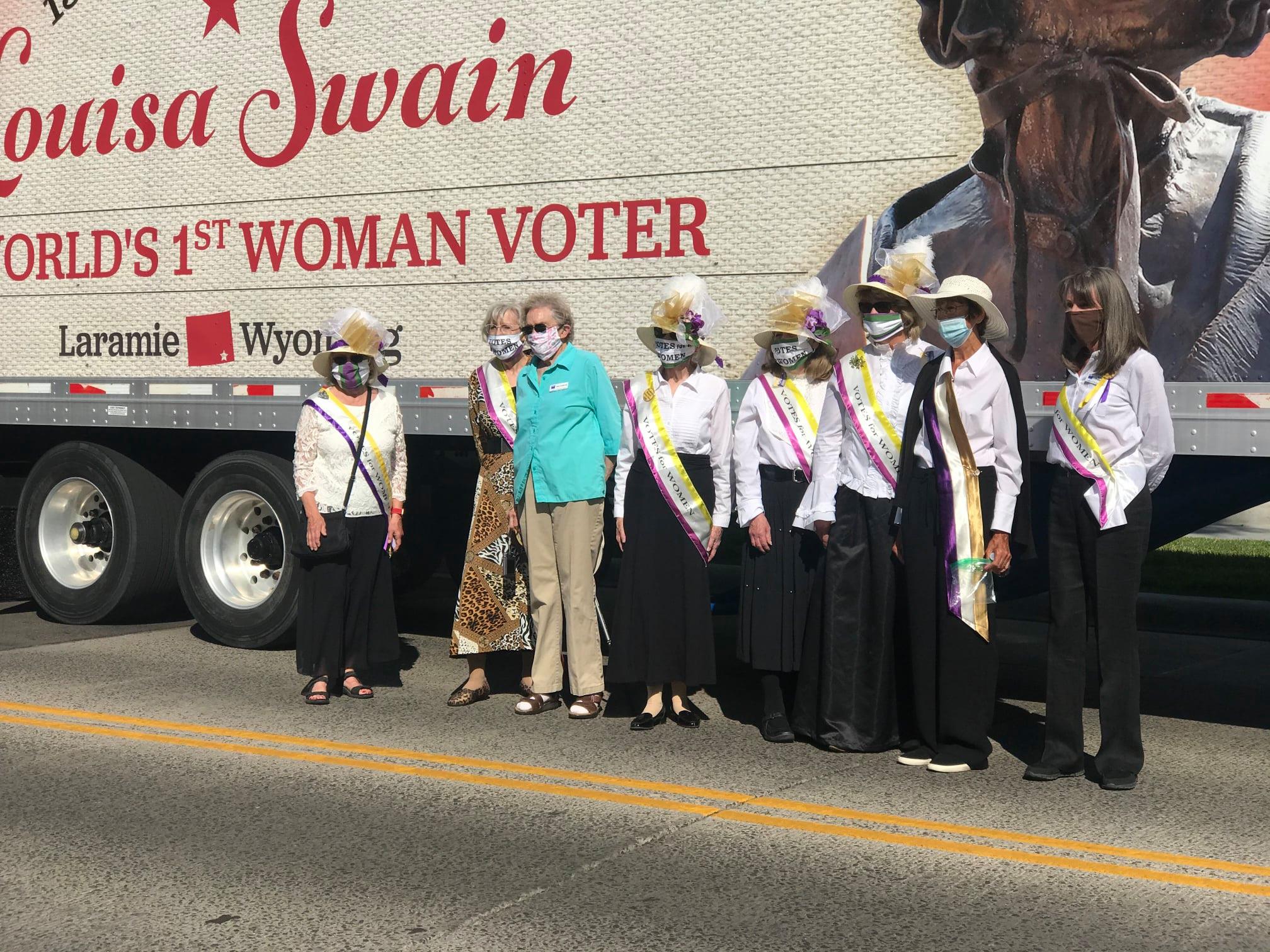 To help celebrate women's suffrage and encourage registration League members dressed in period costumes at the Laramie County Governmental Complex today. They are handing out commemorative suffrage materials along with the Wyoming coin celebrating the 150th anniversary of women's right to vote.