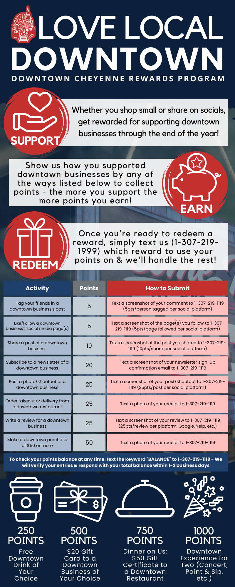 The Cheyenne Downton Development Authority is also hosting a Love Local Downtown Rewards Program. From now until December 31st, collect as many points as possible anytime you support downtown businesses by the different opportunities listed below. No account required – text us (1-307-219-1119) a photo and/or screenshot showing the way you supported local from the list below (i.e. a screenshot of your social media comment tagging your friends in a downtown business post or photo of your receipt) to earn points and add them to your total balance!