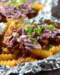6. Divide cheese evenly among fries. Divide pork evenly among fries. Cook for 5 more minutes or until the cheese melts. Remove from grill top with coleslaw and green onions. Serve immediately.