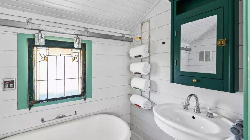 The bathroom is equipped with a claw-foot tub and a pedestal sink. The shower is outside.